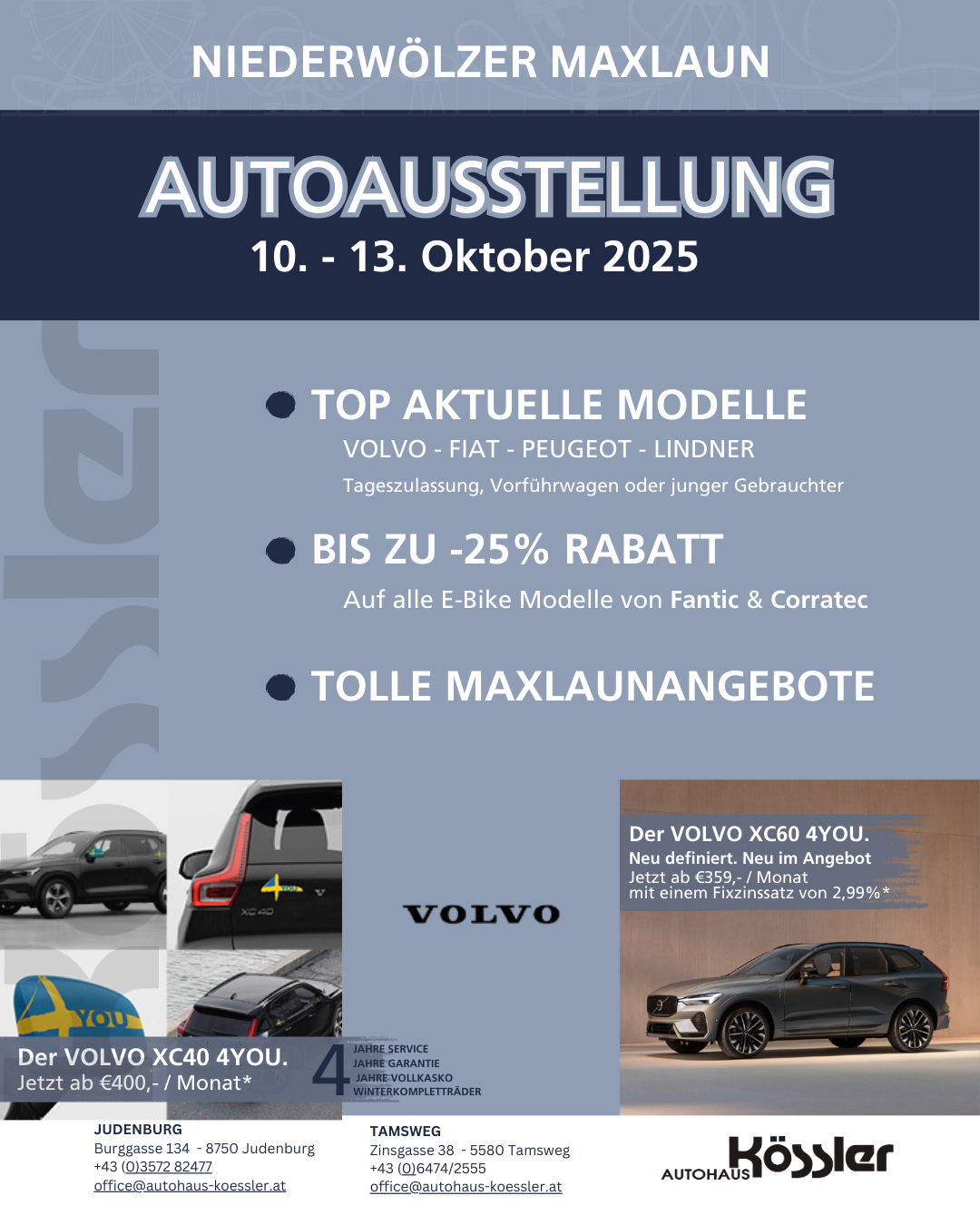 Auch dieses Jahr sind wir wieder Teil des traditionellen Maxlaunermarkts in Niederwölz – und freuen uns, dich von 10. bis 13. Oktober 2025 auf unserem Stand begrüßen zu dürfen!